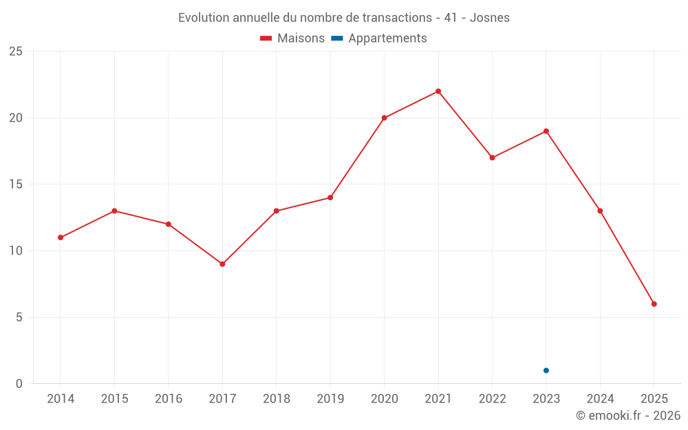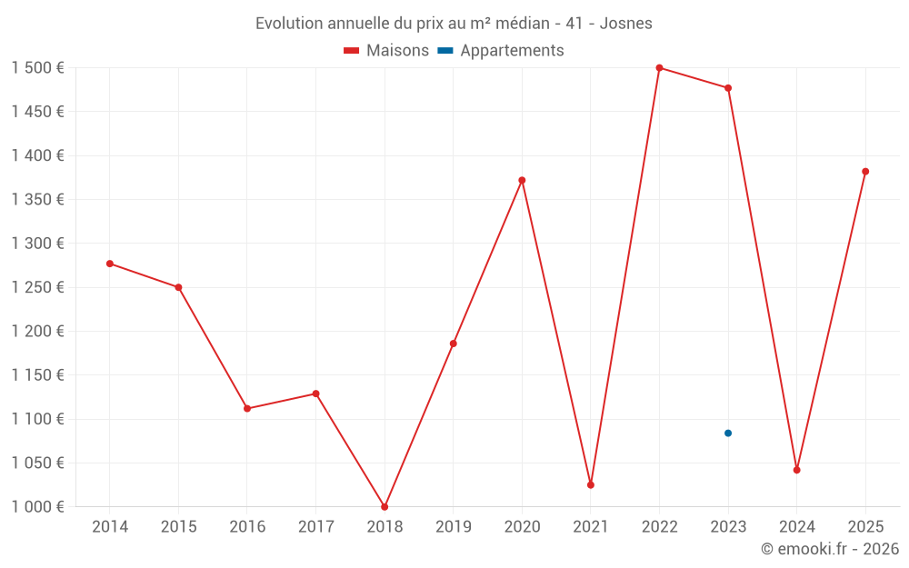 Le prix médian sur les 29 transactions de maisons des 24 derniers mois dans la commune de Josnes était de 1 284 € par mètre carré pour une valeur foncière médiane de 155 000 €. Sur cette période 60% des transactions se sont situées entre 937 et 1 877 € par mètre carré (du 2ème au 8ème déciles).