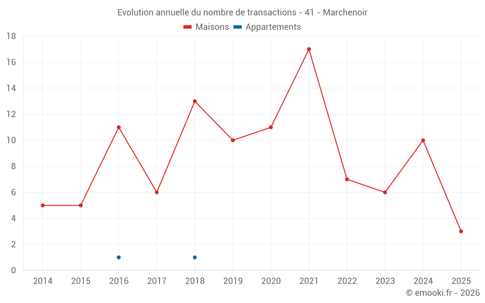 Le prix médian sur les 18 transactions de maisons des 24 derniers mois dans la commune de Marchenoir était de 1 112 € par mètre carré pour une valeur foncière médiane de 123 500 €. Sur cette période 60% des transactions se sont situées entre 795 et 1 490 € par mètre carré (du 2ème au 8ème déciles).