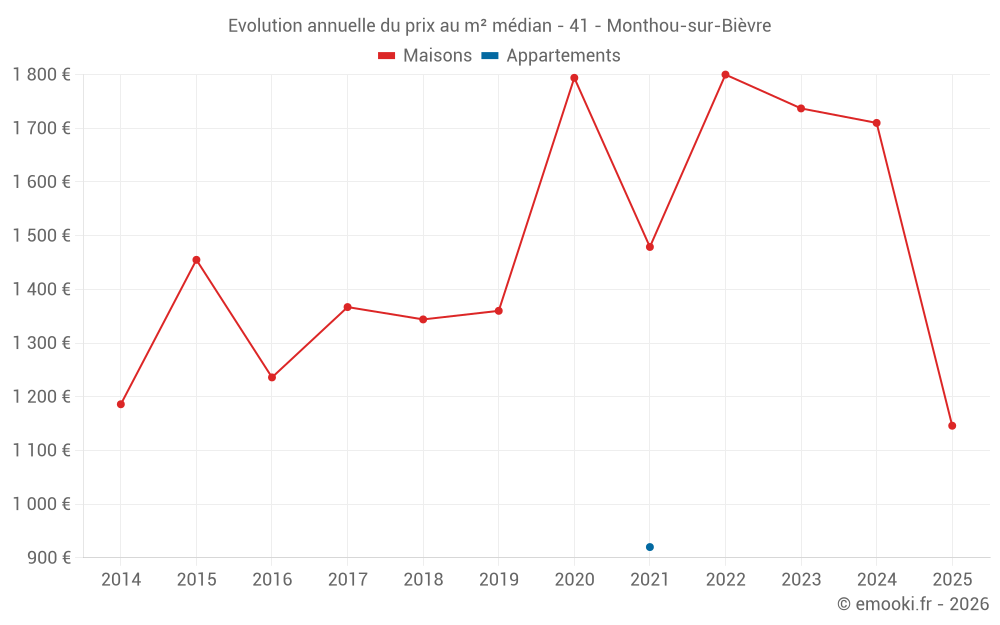 Le prix médian sur les 18 transactions de maisons des 24 derniers mois dans la commune de Monthou-sur-Bièvre était de 1 710 € par mètre carré pour une valeur foncière médiane de 160 000 €. Sur cette période 60% des transactions se sont situées entre 1 113 et 1 966 € par mètre carré (du 2ème au 8ème déciles).