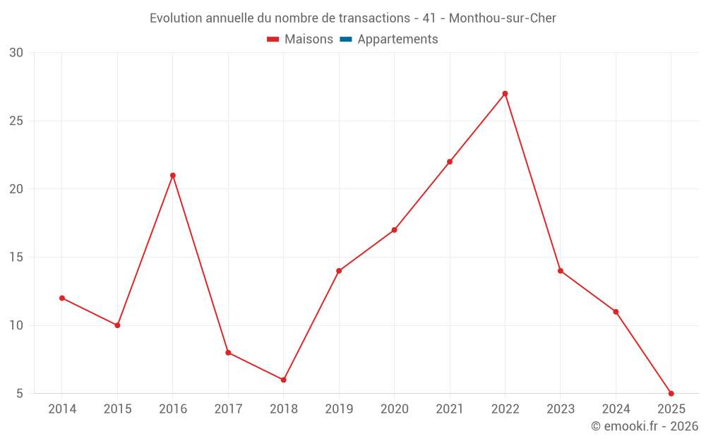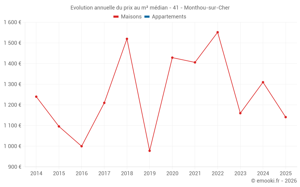 Le prix médian sur les 24 transactions de maisons des 24 derniers mois dans la commune de Monthou-sur-Cher était de 1 327 € par mètre carré pour une valeur foncière médiane de 106 250 €. Sur cette période 60% des transactions se sont situées entre 1 023 et 1 590 € par mètre carré (du 2ème au 8ème déciles).