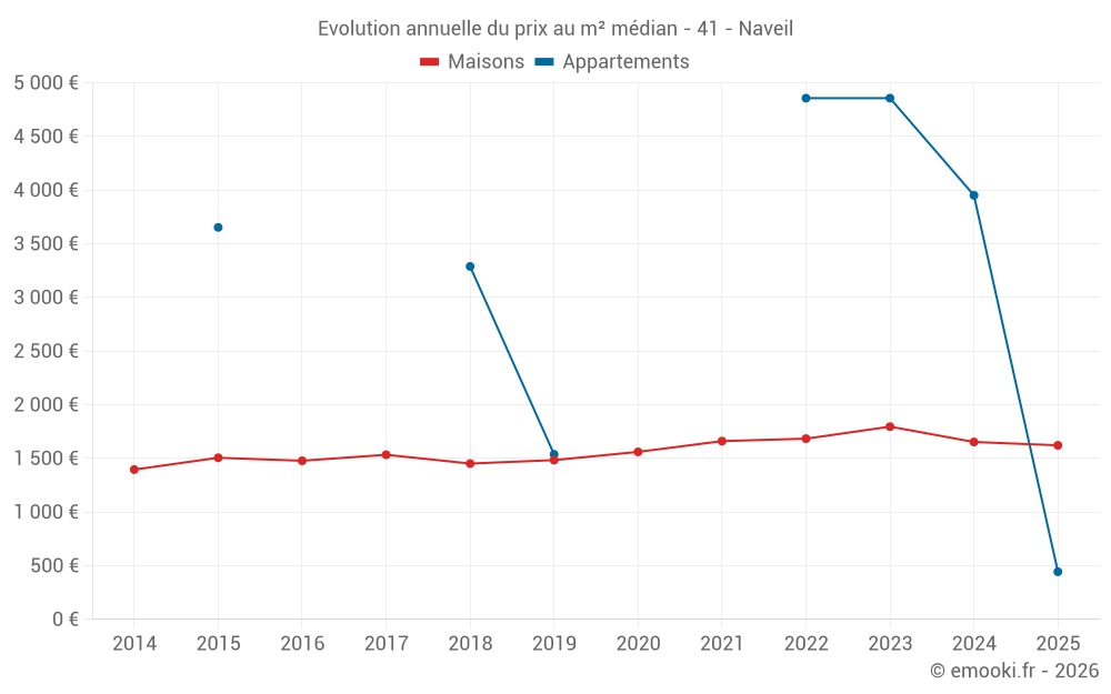 Le prix médian sur les 22 transactions de maisons des 12 derniers mois dans la commune de Naveil était de 1 770 € par mètre carré pour une valeur foncière médiane de 163 500 €. Sur cette période 60% des transactions se sont situées entre 1 580 et 2 102 € par mètre carré (du 2ème au 8ème déciles).