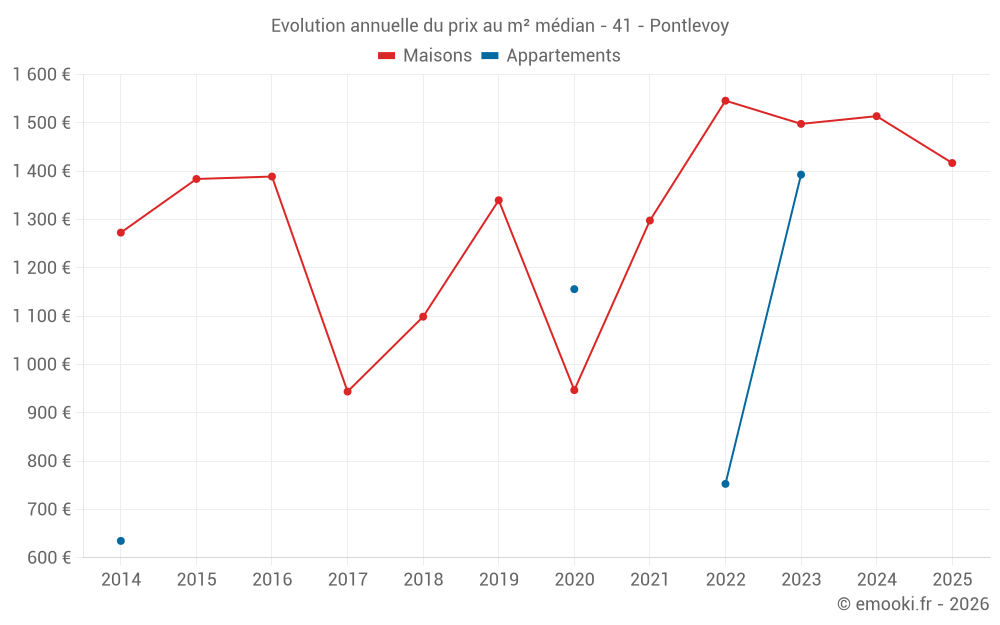 Le prix médian sur les 18 transactions de maisons des 12 derniers mois dans la commune de Pontlevoy était de 1 446 € par mètre carré pour une valeur foncière médiane de 150 000 €. Sur cette période 60% des transactions se sont situées entre 1 059 et 1 574 € par mètre carré (du 2ème au 8ème déciles).