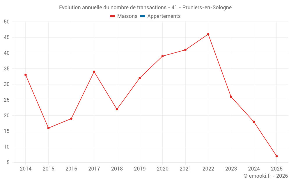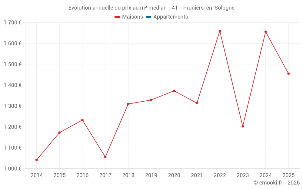 Le prix médian sur les 40 transactions de maisons des 24 derniers mois dans la commune de Pruniers-en-Sologne était de 1 456 € par mètre carré pour une valeur foncière médiane de 170 380 €. Sur cette période 60% des transactions se sont situées entre 943 et 1 905 € par mètre carré (du 2ème au 8ème déciles).
