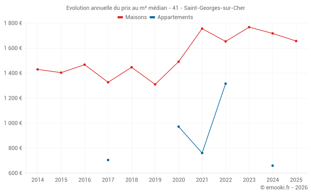 Le prix médian sur les 33 transactions de maisons des 12 derniers mois dans la commune de Saint-Georges-sur-Cher était de 1 728 € par mètre carré pour une valeur foncière médiane de 159 800 €. Sur cette période 60% des transactions se sont situées entre 1 250 et 2 206 € par mètre carré (du 2ème au 8ème déciles).