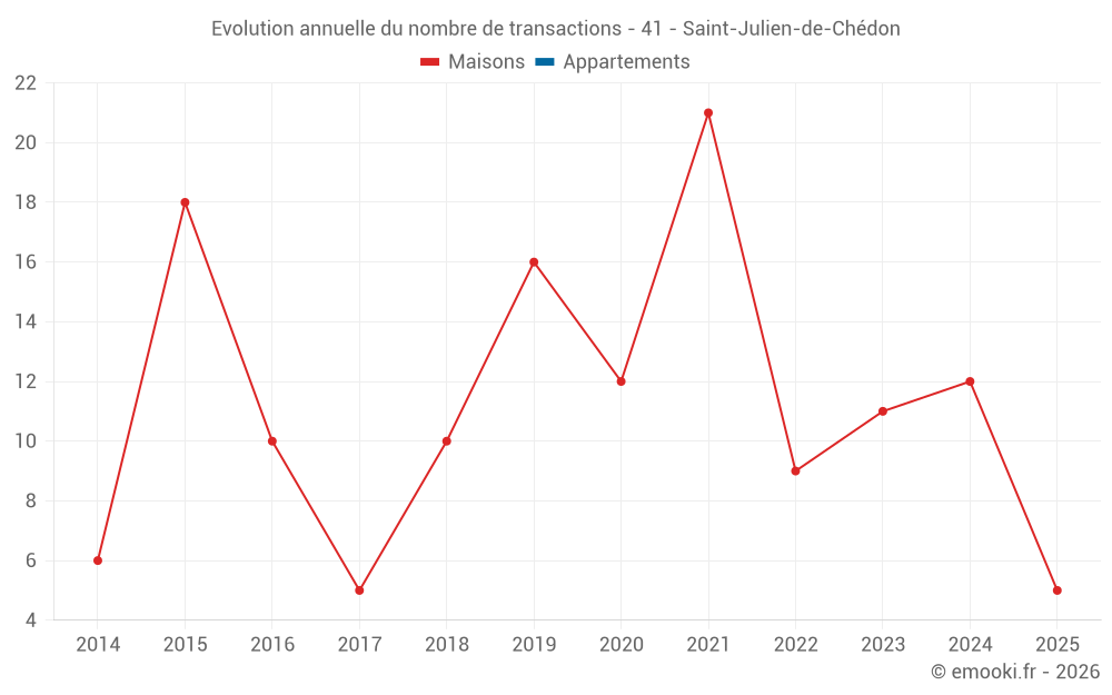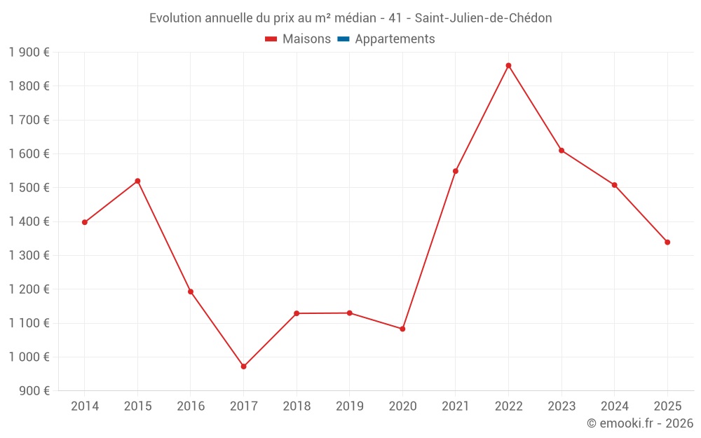 Le prix médian sur les 24 transactions de maisons des 24 derniers mois dans la commune de Saint-Julien-de-Chédon était de 1 522 € par mètre carré pour une valeur foncière médiane de 129 000 €. Sur cette période 60% des transactions se sont situées entre 1 056 et 1 729 € par mètre carré (du 2ème au 8ème déciles).