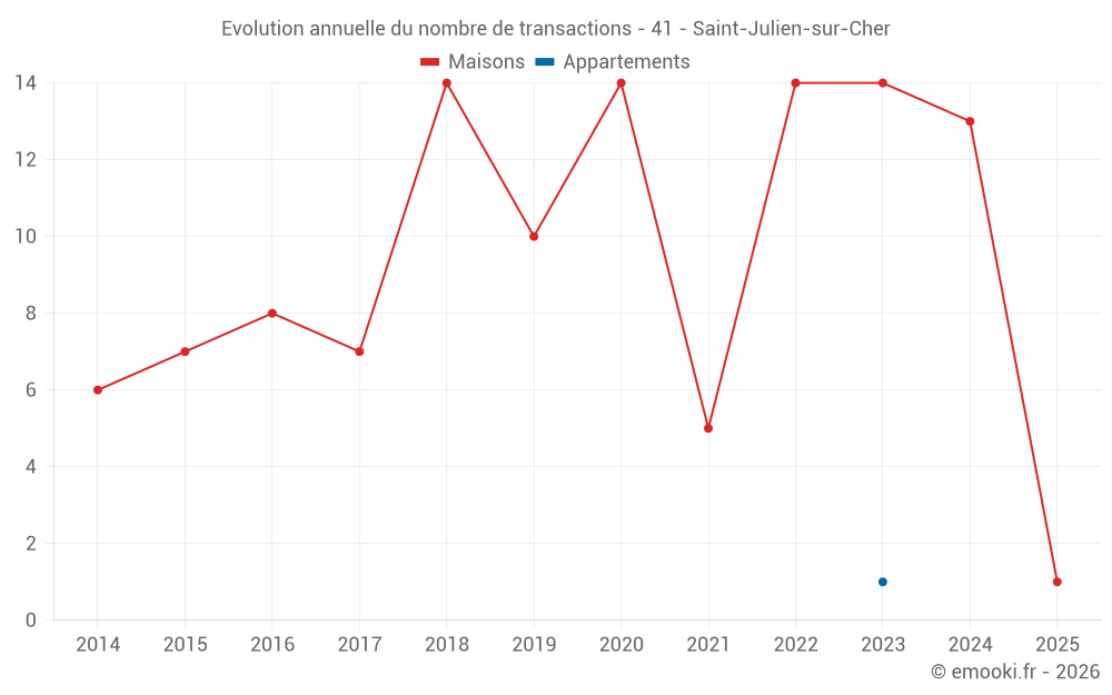 Le prix médian sur les 23 transactions de maisons des 24 derniers mois dans la commune de Saint-Julien-sur-Cher était de 1 250 € par mètre carré pour une valeur foncière médiane de 120 000 €. Sur cette période 60% des transactions se sont situées entre 817 et 1 679 € par mètre carré (du 2ème au 8ème déciles).
