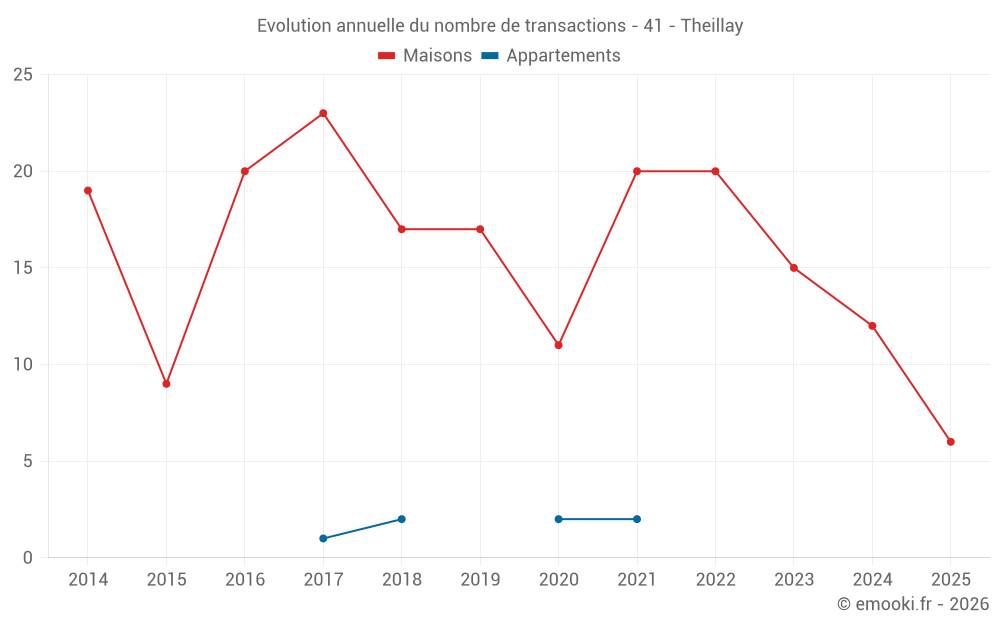 Le prix médian sur les 17 transactions de maisons des 12 derniers mois dans la commune de Theillay était de 1 343 € par mètre carré pour une valeur foncière médiane de 120 000 €. Sur cette période 60% des transactions se sont situées entre 1 106 et 1 603 € par mètre carré (du 2ème au 8ème déciles).