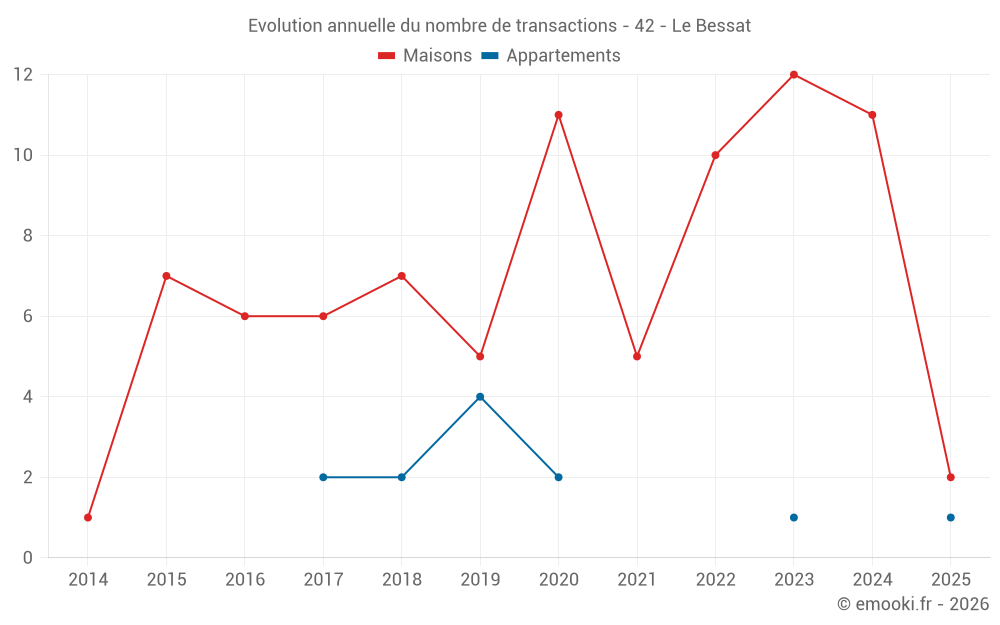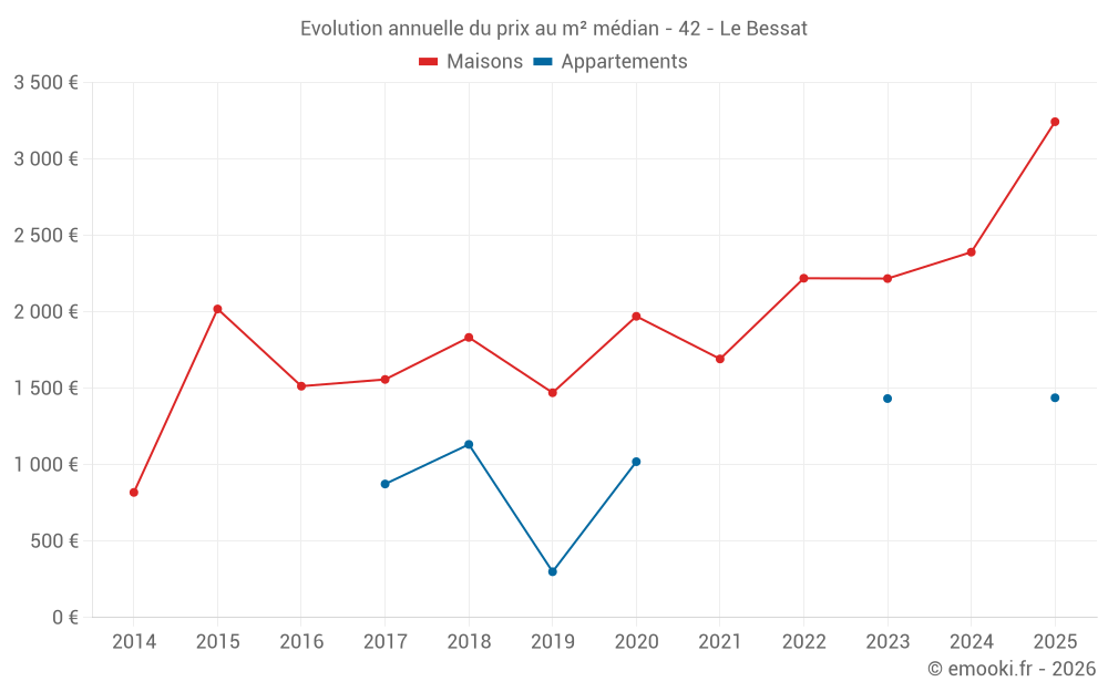 Le prix médian sur les 18 transactions de maisons des 24 derniers mois dans la commune du Bessat était de 2 390 € par mètre carré pour une valeur foncière médiane de 218 500 €. Sur cette période 60% des transactions se sont situées entre 1 531 et 3 409 € par mètre carré (du 2ème au 8ème déciles).