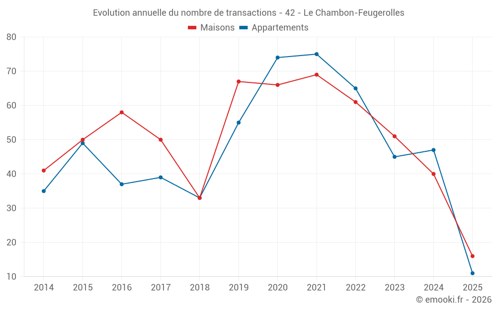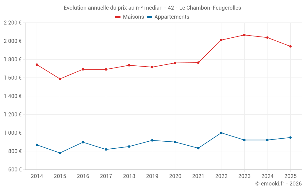 Le prix médian sur les 32 transactions de maisons des 12 derniers mois dans la commune du Chambon-Feugerolles était de 2 090 € par mètre carré pour une valeur foncière médiane de 182 000 €. Sur cette période 60% des transactions se sont situées entre 1 704 et 2 365 € par mètre carré (du 2ème au 8ème déciles).