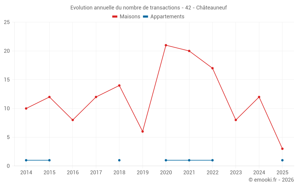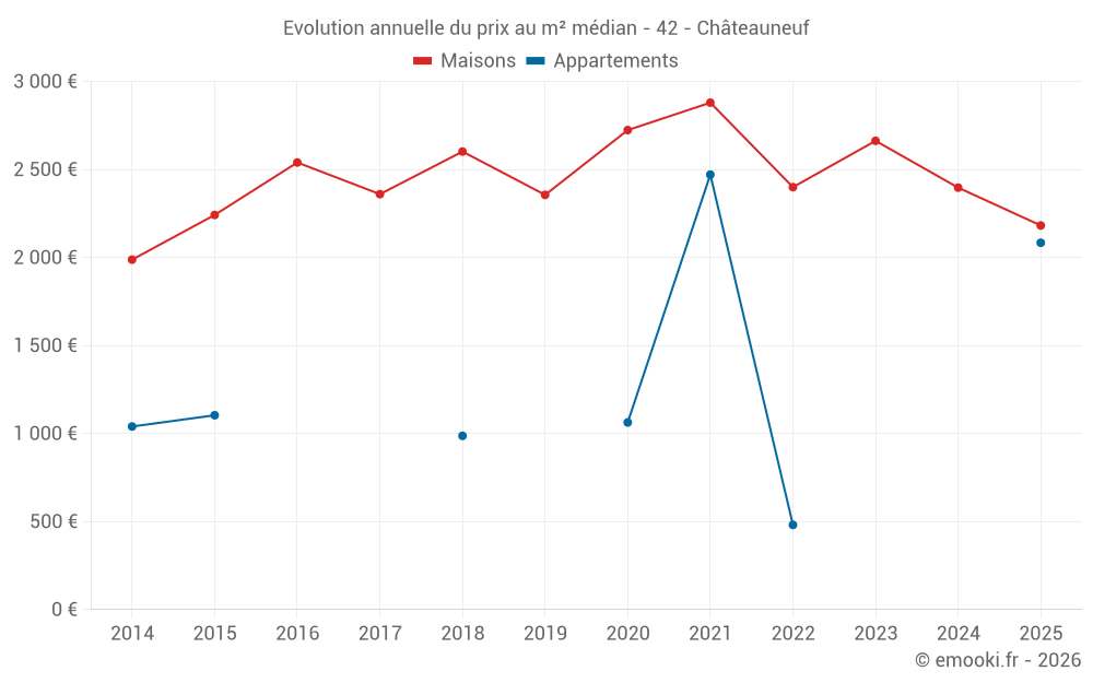 Le prix médian sur les 21 transactions de maisons des 24 derniers mois dans la commune de Châteauneuf était de 2 846 € par mètre carré pour une valeur foncière médiane de 236 850 €. Sur cette période 60% des transactions se sont situées entre 1 516 et 3 359 € par mètre carré (du 2ème au 8ème déciles).