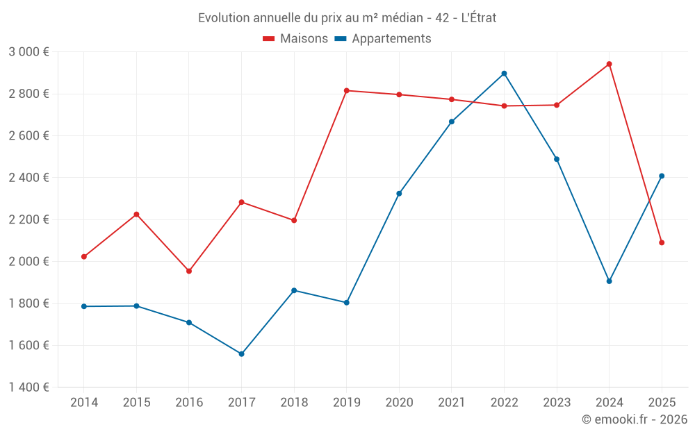 Le prix médian sur les 25 transactions de maisons des 24 derniers mois dans la commune de l'Étrat était de 2 797 € par mètre carré pour une valeur foncière médiane de 310 000 €. Sur cette période 60% des transactions se sont situées entre 1 892 et 3 257 € par mètre carré (du 2ème au 8ème déciles).
