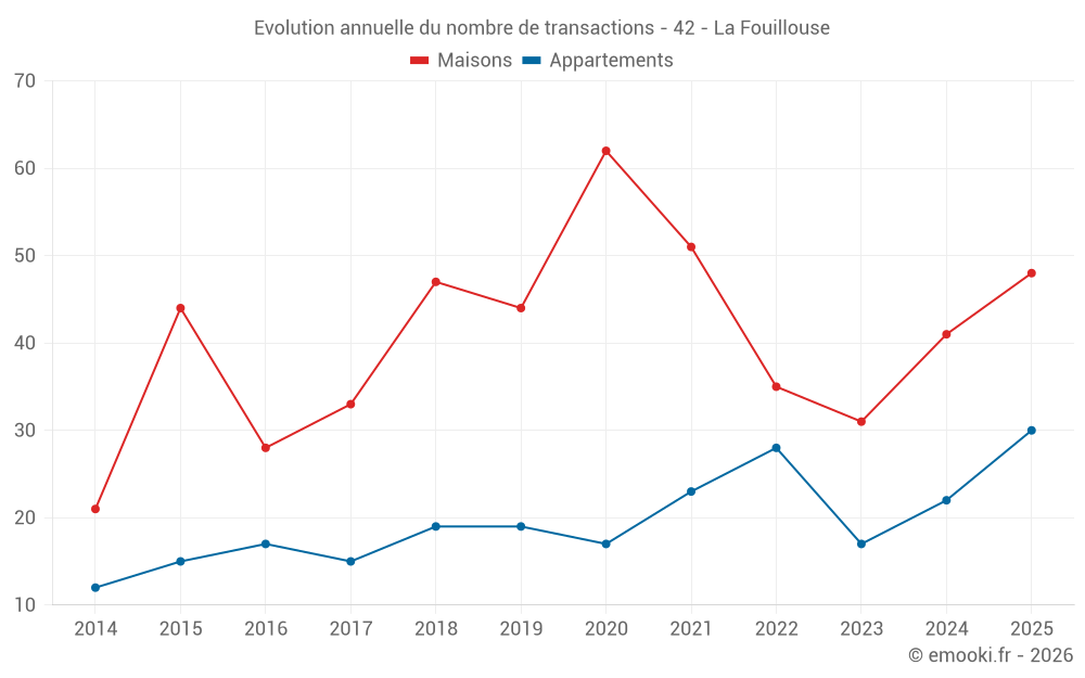 Le prix médian sur les 31 transactions de maisons des 6 derniers mois dans la commune de la Fouillouse était de 2 750 € par mètre carré pour une valeur foncière médiane de 282 000 €. Sur cette période 60% des transactions se sont situées entre 2 293 et 3 311 € par mètre carré (du 2ème au 8ème déciles).