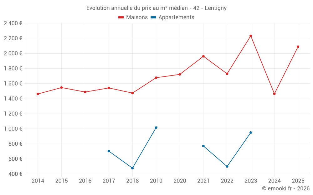 Le prix médian sur les 25 transactions de maisons des 24 derniers mois dans la commune de Lentigny était de 2 089 € par mètre carré pour une valeur foncière médiane de 206 800 €. Sur cette période 60% des transactions se sont situées entre 1 398 et 2 593 € par mètre carré (du 2ème au 8ème déciles).