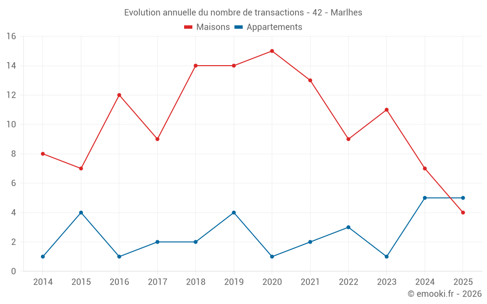 Le prix médian sur les 17 transactions de maisons des 24 derniers mois dans la commune de Marlhes était de 1 846 € par mètre carré pour une valeur foncière médiane de 205 600 €. Sur cette période 60% des transactions se sont situées entre 1 407 et 2 193 € par mètre carré (du 2ème au 8ème déciles).