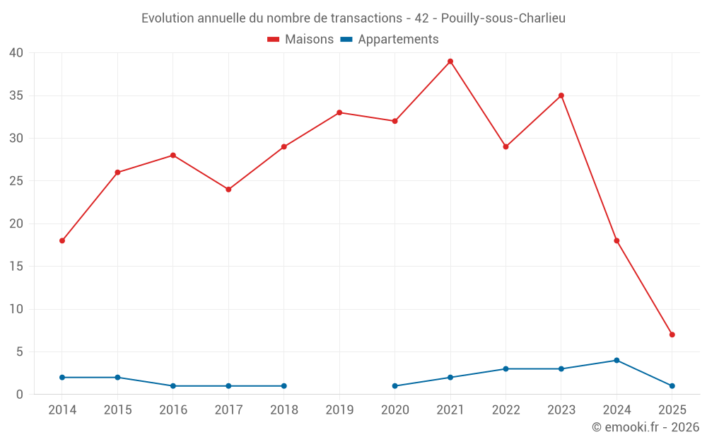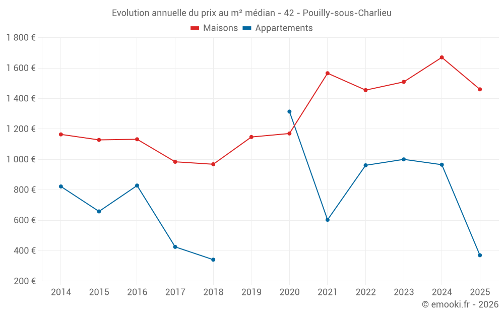Le prix médian sur les 43 transactions de maisons des 24 derniers mois dans la commune de Pouilly-sous-Charlieu était de 1 506 € par mètre carré pour une valeur foncière médiane de 135 000 €. Sur cette période 60% des transactions se sont situées entre 1 060 et 1 902 € par mètre carré (du 2ème au 8ème déciles).