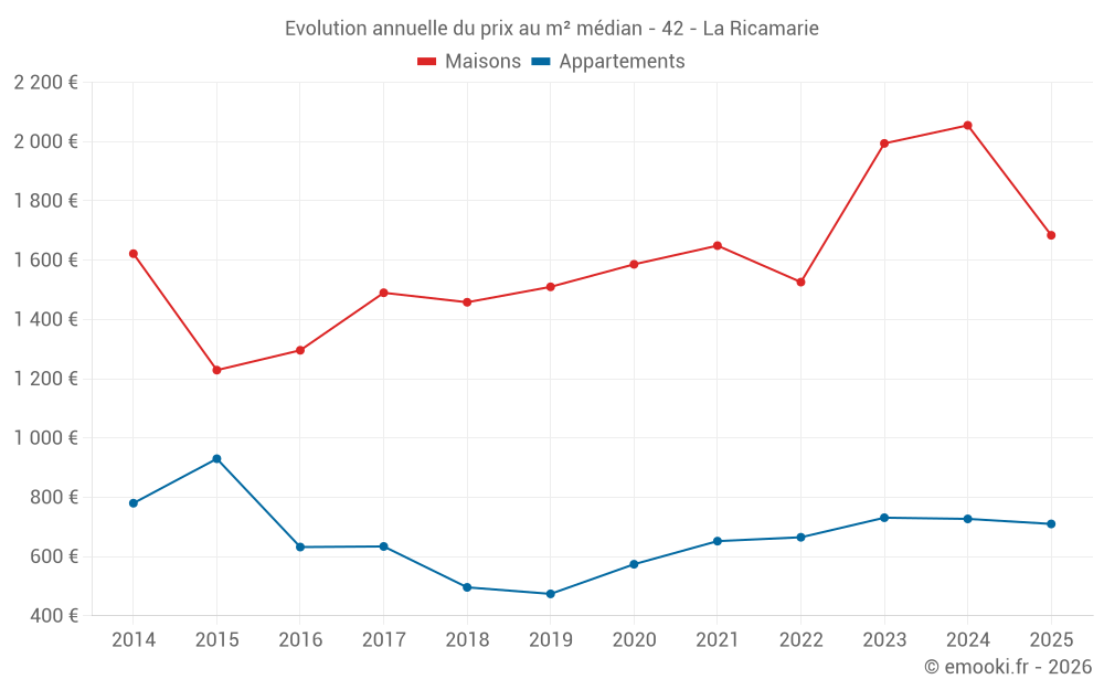 Le prix médian sur les 20 transactions de maisons des 12 derniers mois dans la commune de la Ricamarie était de 2 040 € par mètre carré pour une valeur foncière médiane de 189 000 €. Sur cette période 60% des transactions se sont situées entre 1 359 et 2 455 € par mètre carré (du 2ème au 8ème déciles).