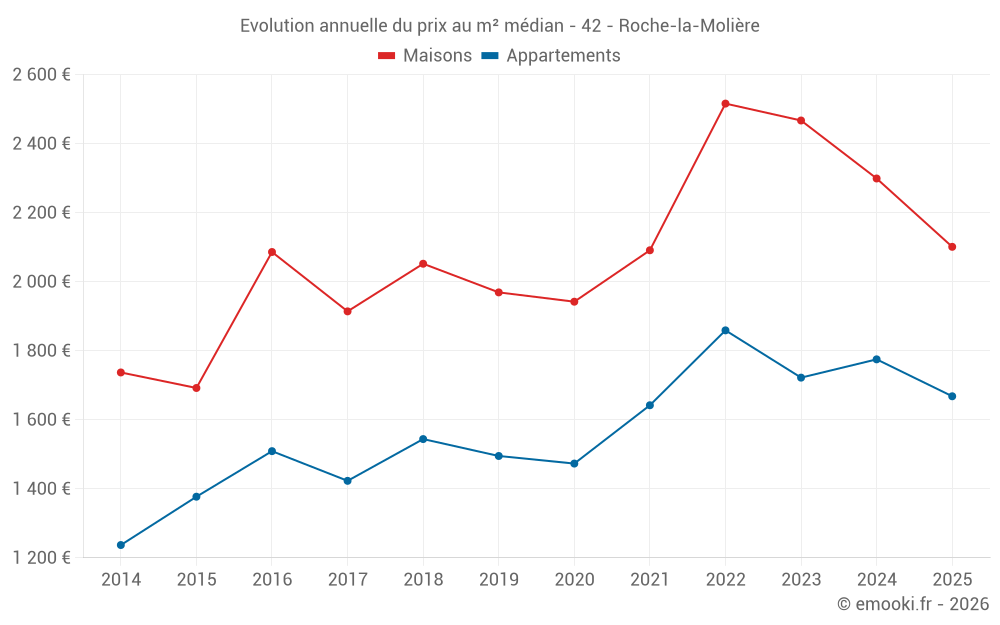 Le prix médian sur les 36 transactions d'appartements des 12 derniers mois dans la commune de Roche-la-Molière était de 1 693 € par mètre carré pour une valeur foncière médiane de 130 015 €. Sur cette période 60% des transactions se sont situées entre 1 205 et 2 171 € par mètre carré (du 2ème au 8ème déciles).
