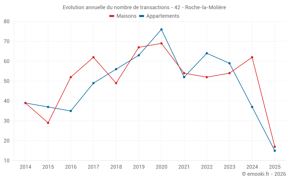 Le prix médian sur les 60 transactions de maisons des 12 derniers mois dans la commune de Roche-la-Molière était de 2 281 € par mètre carré pour une valeur foncière médiane de 216 750 €. Sur cette période 60% des transactions se sont situées entre 1 712 et 2 994 € par mètre carré (du 2ème au 8ème déciles).