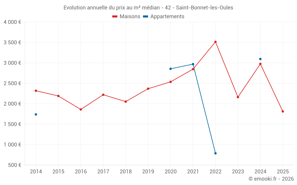 Le prix médian sur les 19 transactions de maisons des 12 derniers mois dans la commune de Saint-Bonnet-les-Oules était de 2 870 € par mètre carré pour une valeur foncière médiane de 259 000 €. Sur cette période 60% des transactions se sont situées entre 1 622 et 3 355 € par mètre carré (du 2ème au 8ème déciles).