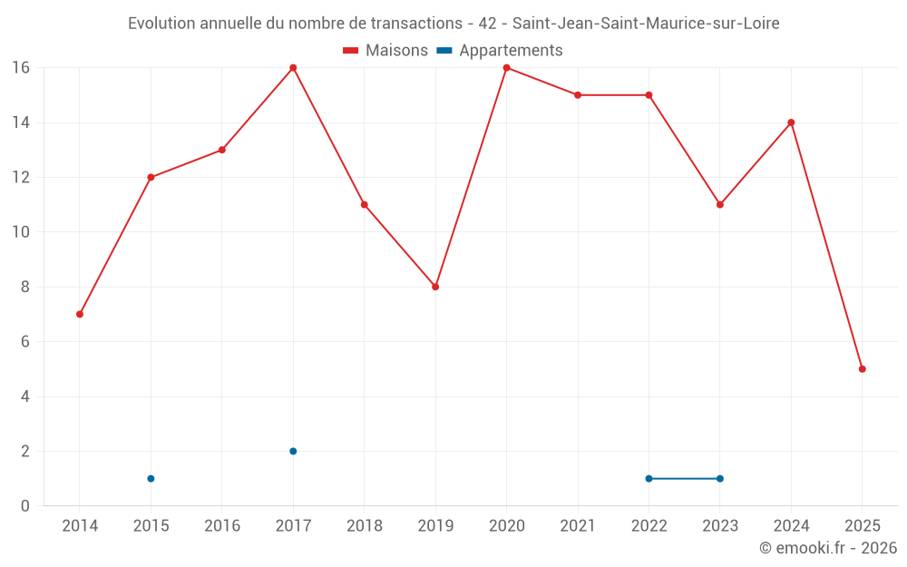 Le prix médian sur les 23 transactions de maisons des 24 derniers mois dans la commune de Saint-Jean-Saint-Maurice-sur-Loire était de 1 591 € par mètre carré pour une valeur foncière médiane de 167 000 €. Sur cette période 60% des transactions se sont situées entre 1 121 et 2 058 € par mètre carré (du 2ème au 8ème déciles).