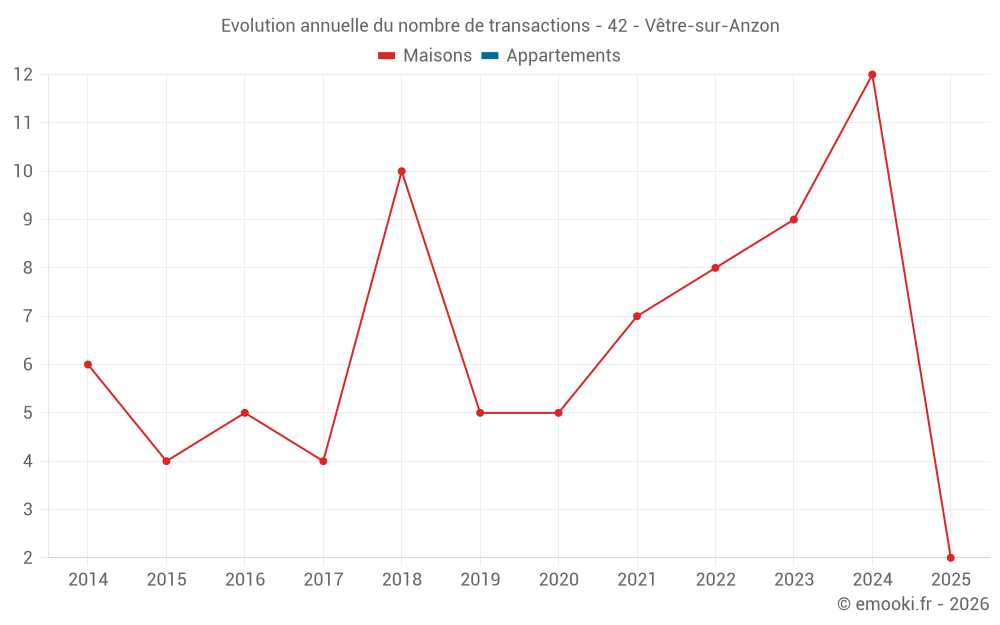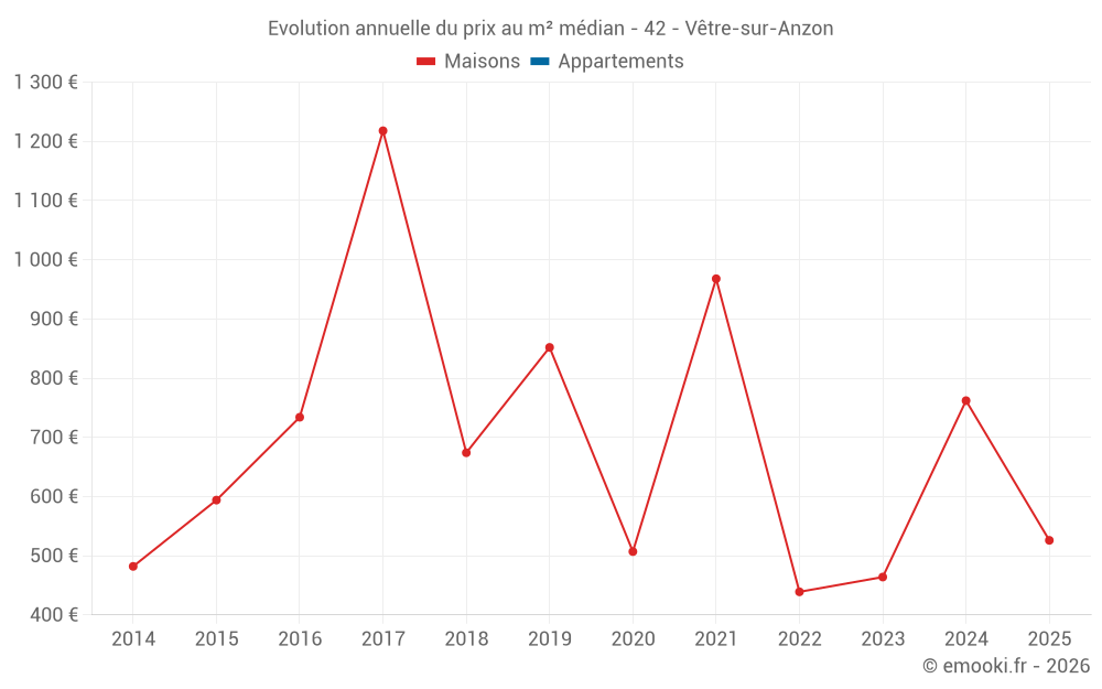 Le prix médian sur les 17 transactions de maisons des 24 derniers mois dans la commune de Vêtre-sur-Anzon était de 692 € par mètre carré pour une valeur foncière médiane de 78 400 €. Sur cette période 60% des transactions se sont situées entre 289 et 1 537 € par mètre carré (du 2ème au 8ème déciles).