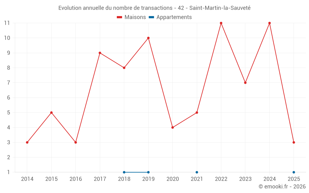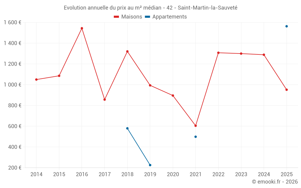 Le prix médian sur les 18 transactions de maisons des 24 derniers mois dans la commune de Saint-Martin-la-Sauveté était de 1 294 € par mètre carré pour une valeur foncière médiane de 120 000 €. Sur cette période 60% des transactions se sont situées entre 833 et 1 957 € par mètre carré (du 2ème au 8ème déciles).