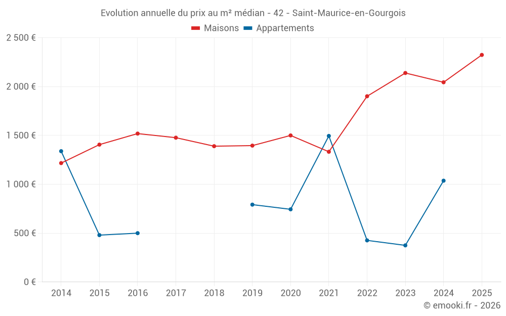 Le prix médian sur les 17 transactions de maisons des 12 derniers mois dans la commune de Saint-Maurice-en-Gourgois était de 2 029 € par mètre carré pour une valeur foncière médiane de 142 000 €. Sur cette période 60% des transactions se sont situées entre 802 et 2 685 € par mètre carré (du 2ème au 8ème déciles).