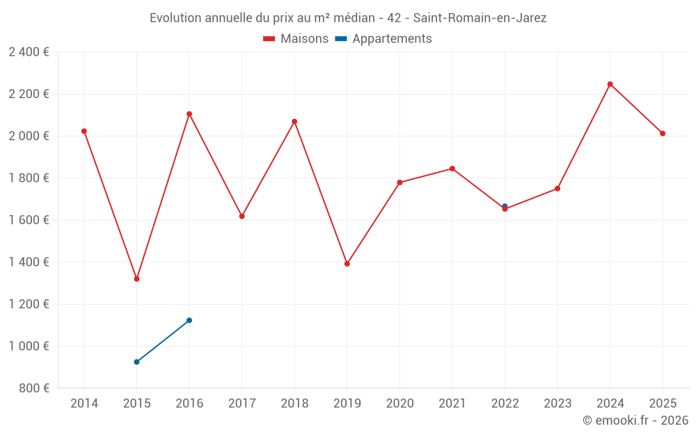 Le prix médian sur les 17 transactions de maisons des 24 derniers mois dans la commune de Saint-Romain-en-Jarez était de 1 674 € par mètre carré pour une valeur foncière médiane de 215 000 €. Sur cette période 60% des transactions se sont situées entre 1 517 et 2 447 € par mètre carré (du 2ème au 8ème déciles).
