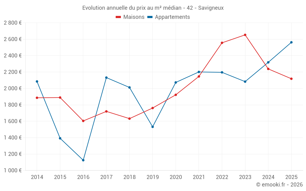 Le prix médian sur les 20 transactions d'appartements des 24 derniers mois dans la commune de Savigneux était de 2 359 € par mètre carré pour une valeur foncière médiane de 181 500 €. Sur cette période 60% des transactions se sont situées entre 2 153 et 2 577 € par mètre carré (du 2ème au 8ème déciles).