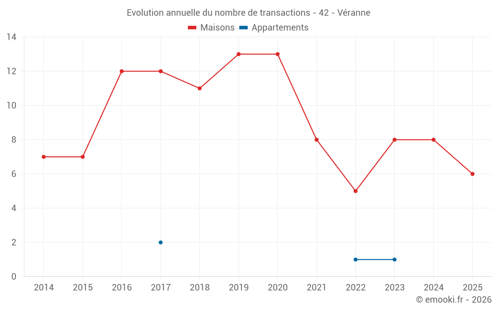 Le prix médian sur les 20 transactions de maisons des 24 derniers mois dans la commune de Véranne était de 2 404 € par mètre carré pour une valeur foncière médiane de 303 725 €. Sur cette période 60% des transactions se sont situées entre 1 253 et 2 951 € par mètre carré (du 2ème au 8ème déciles).