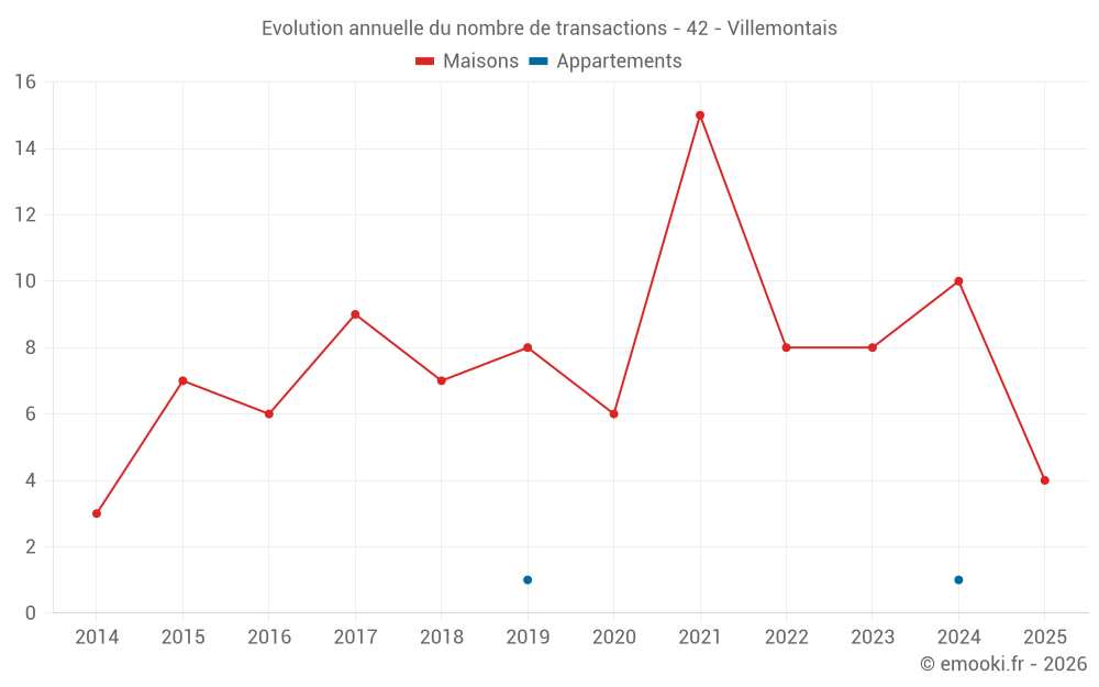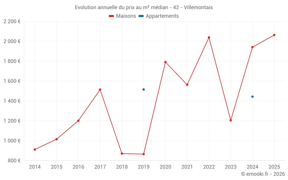 Le prix médian sur les 19 transactions de maisons des 24 derniers mois dans la commune de Villemontais était de 1 927 € par mètre carré pour une valeur foncière médiane de 163 600 €. Sur cette période 60% des transactions se sont situées entre 913 et 2 264 € par mètre carré (du 2ème au 8ème déciles).