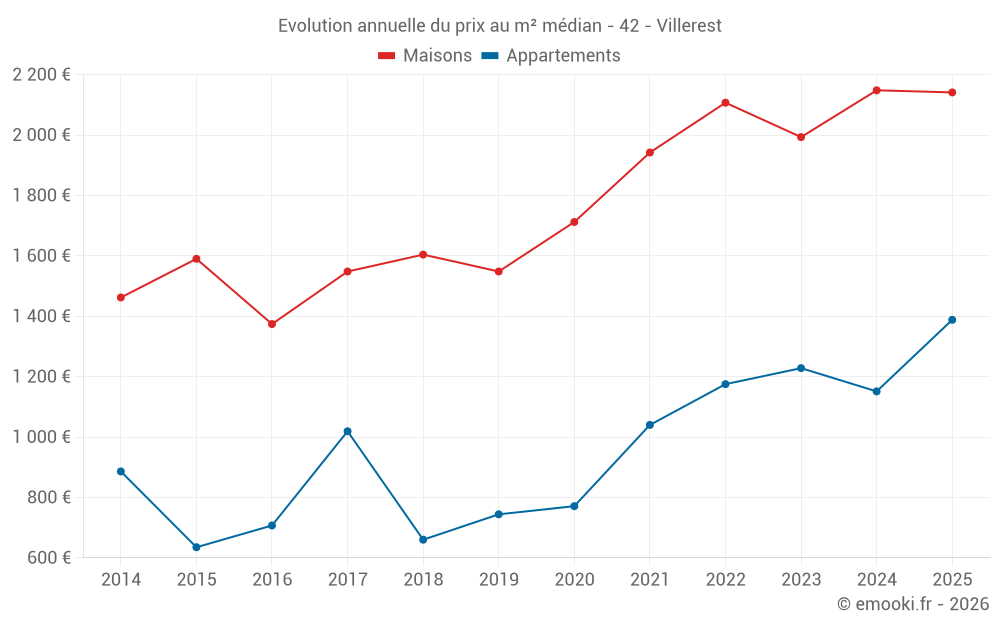 Le prix médian sur les 25 transactions de maisons des 6 derniers mois dans la commune de Villerest était de 2 141 € par mètre carré pour une valeur foncière médiane de 212 000 €. Sur cette période 60% des transactions se sont situées entre 975 et 2 434 € par mètre carré (du 2ème au 8ème déciles).