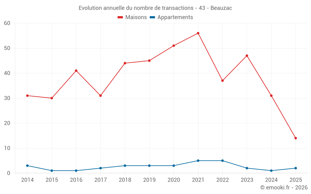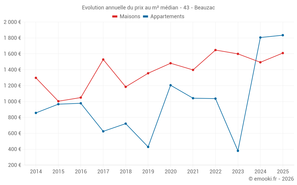 Le prix médian sur les 32 transactions de maisons des 12 derniers mois dans la commune de Beauzac était de 1 859 € par mètre carré pour une valeur foncière médiane de 155 185 €. Sur cette période 60% des transactions se sont situées entre 987 et 2 568 € par mètre carré (du 2ème au 8ème déciles).