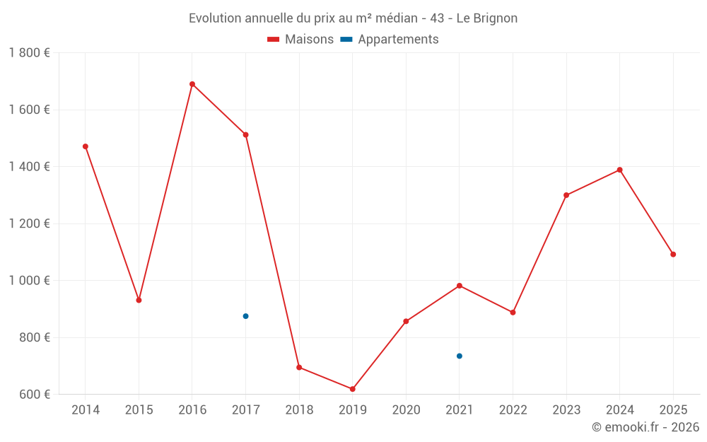 Le prix médian sur les 15 transactions de maisons des 24 derniers mois dans la commune du Brignon était de 1 260 € par mètre carré pour une valeur foncière médiane de 133 000 €. Sur cette période 60% des transactions se sont situées entre 650 et 1 945 € par mètre carré (du 2ème au 8ème déciles).