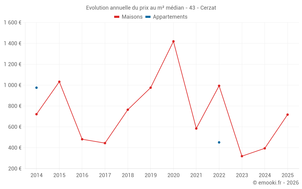 Le prix au m² des maisons a augmenté de 23% depuis 4 ans, mais il a diminué de 26% en 6 ans.