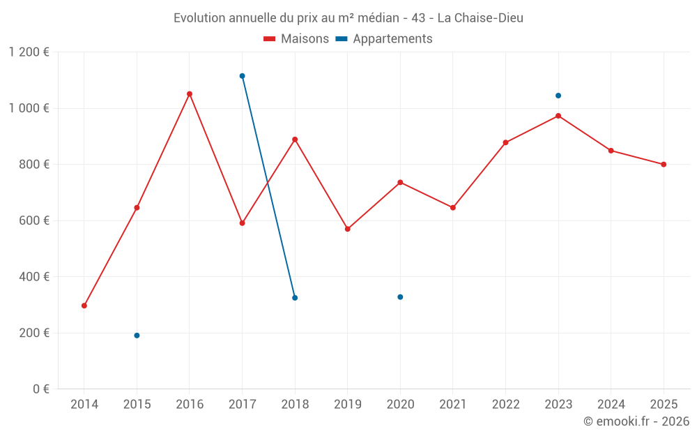 Le prix médian sur les 20 transactions de maisons des 24 derniers mois dans la commune de la Chaise-Dieu était de 864 € par mètre carré pour une valeur foncière médiane de 75 950 €. Sur cette période 60% des transactions se sont situées entre 393 et 1 630 € par mètre carré (du 2ème au 8ème déciles).