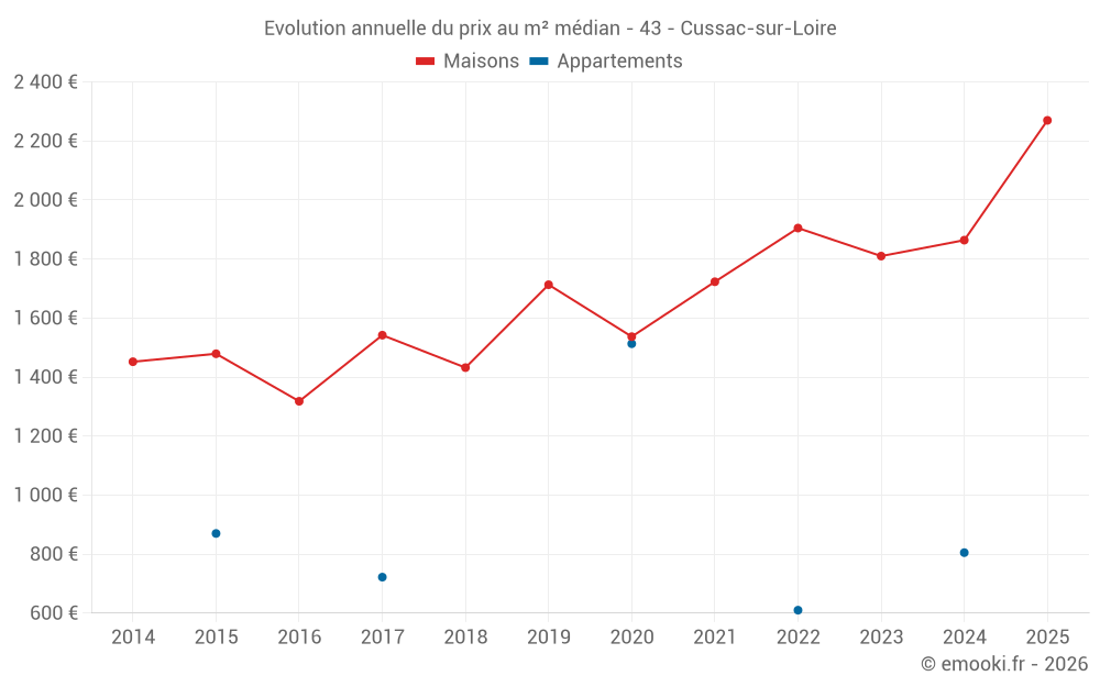 Le prix médian sur les 21 transactions de maisons des 24 derniers mois dans la commune de Cussac-sur-Loire était de 1 839 € par mètre carré pour une valeur foncière médiane de 199 500 €. Sur cette période 60% des transactions se sont situées entre 1 513 et 2 348 € par mètre carré (du 2ème au 8ème déciles).