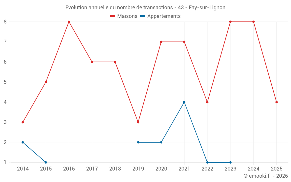Le prix médian sur les 17 transactions de maisons des 24 derniers mois dans la commune de Fay-sur-Lignon était de 983 € par mètre carré pour une valeur foncière médiane de 72 000 €. Sur cette période 60% des transactions se sont situées entre 790 et 1 832 € par mètre carré (du 2ème au 8ème déciles).