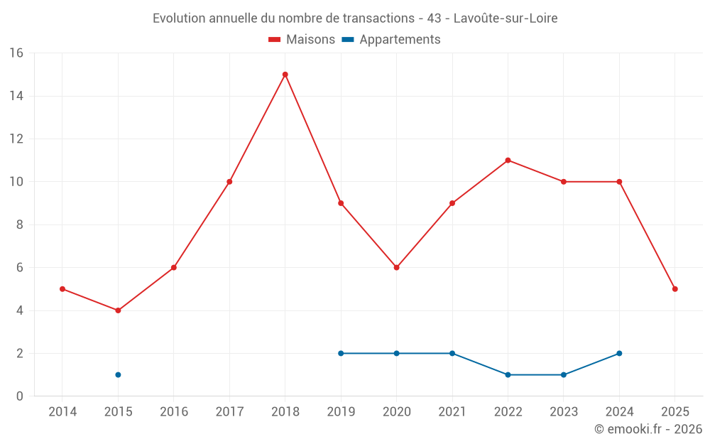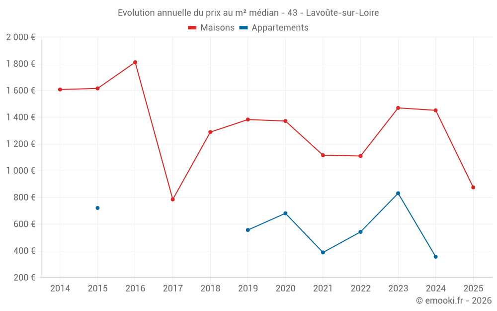 Le prix médian sur les 17 transactions de maisons des 24 derniers mois dans la commune de Lavoûte-sur-Loire était de 1 377 € par mètre carré pour une valeur foncière médiane de 98 600 €. Sur cette période 60% des transactions se sont situées entre 751 et 1 778 € par mètre carré (du 2ème au 8ème déciles).
