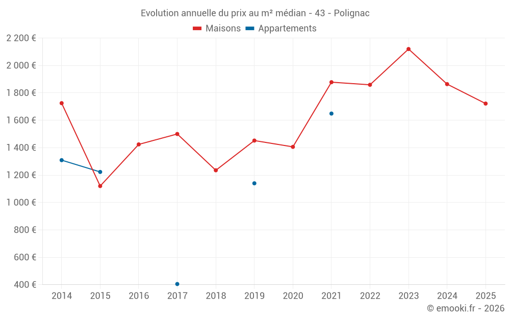 Le prix médian sur les 16 transactions de maisons des 12 derniers mois dans la commune de Polignac était de 1 744 € par mètre carré pour une valeur foncière médiane de 182 450 €. Sur cette période 60% des transactions se sont situées entre 1 000 et 2 238 € par mètre carré (du 2ème au 8ème déciles).
