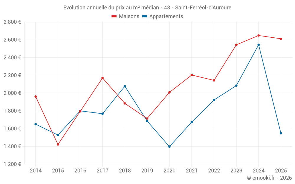 Le prix médian sur les 16 transactions de maisons des 12 derniers mois dans la commune de Saint-Ferréol-d'Auroure était de 2 626 € par mètre carré pour une valeur foncière médiane de 252 775 €. Sur cette période 60% des transactions se sont situées entre 1 540 et 2 916 € par mètre carré (du 2ème au 8ème déciles).