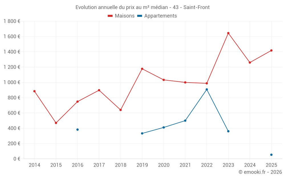 Le prix médian sur les 18 transactions de maisons des 24 derniers mois dans la commune de Saint-Front était de 1 438 € par mètre carré pour une valeur foncière médiane de 115 912 €. Sur cette période 60% des transactions se sont situées entre 948 et 2 042 € par mètre carré (du 2ème au 8ème déciles).