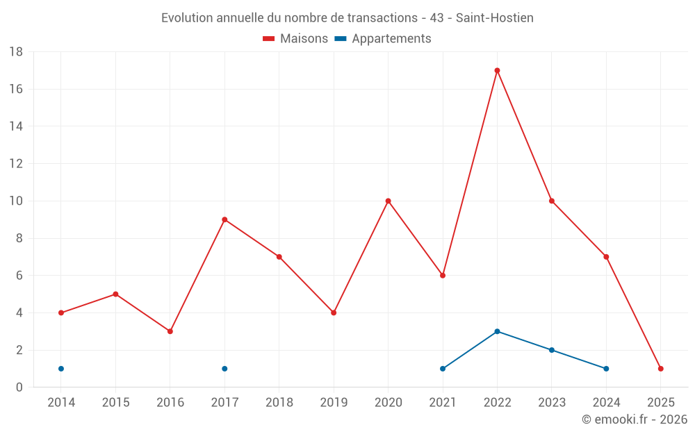 Le prix médian sur les 15 transactions de maisons des 24 derniers mois dans la commune de Saint-Hostien était de 2 000 € par mètre carré pour une valeur foncière médiane de 183 900 €. Sur cette période 60% des transactions se sont situées entre 1 208 et 2 384 € par mètre carré (du 2ème au 8ème déciles).