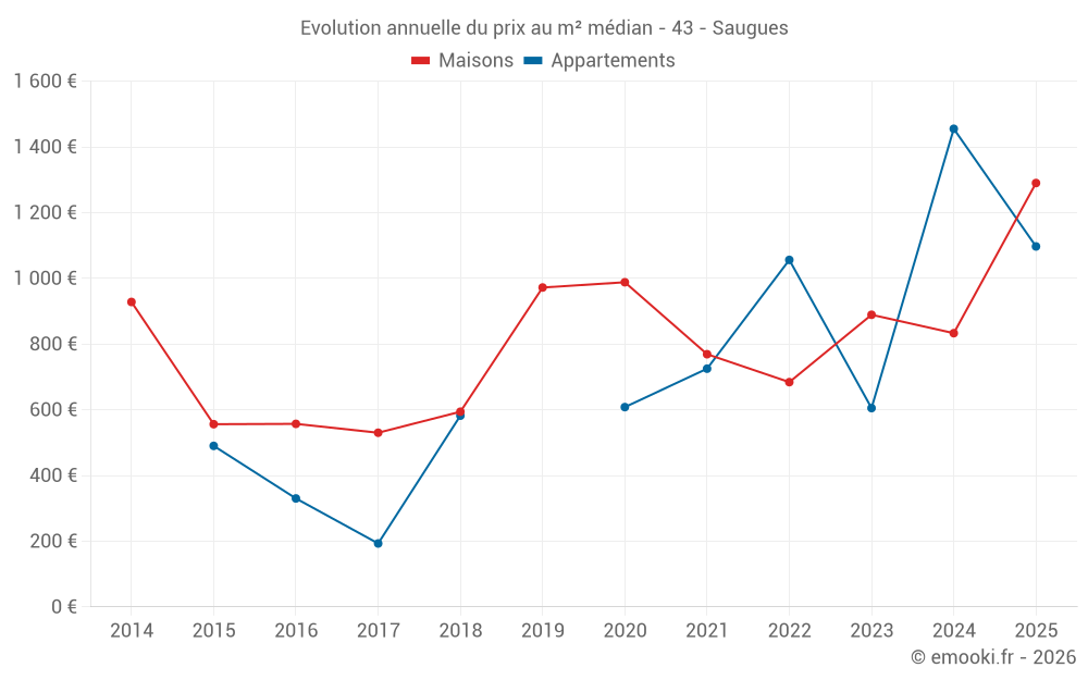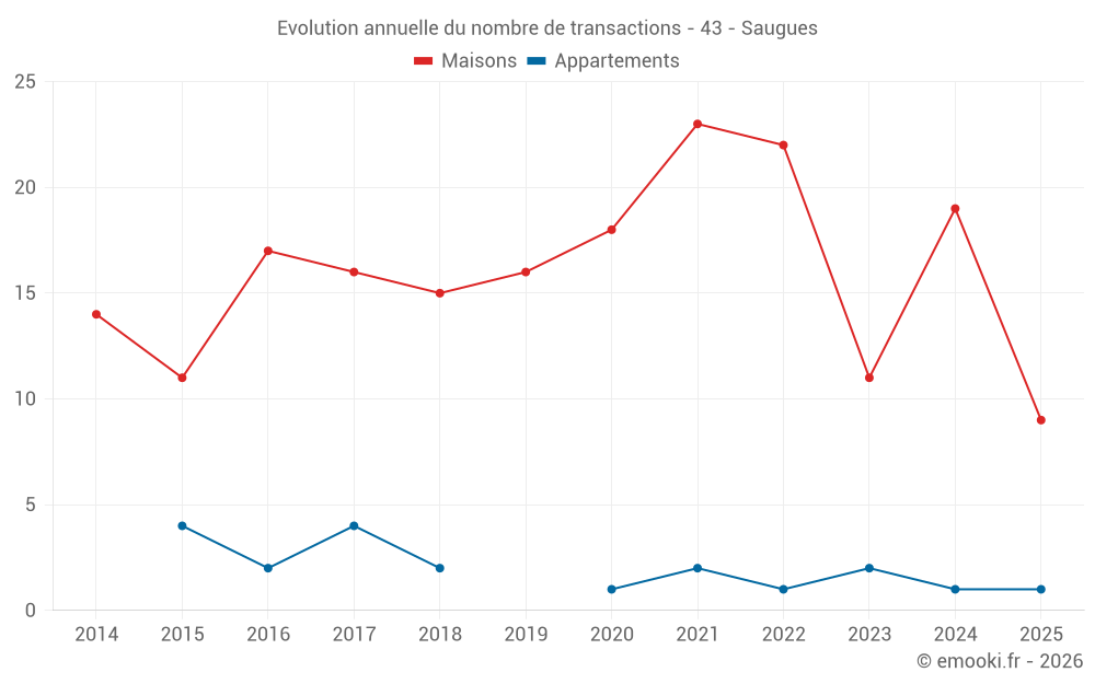 Le prix médian sur les 18 transactions de maisons des 12 derniers mois dans la commune de Saugues était de 784 € par mètre carré pour une valeur foncière médiane de 64 688 €. Sur cette période 60% des transactions se sont situées entre 218 et 1 776 € par mètre carré (du 2ème au 8ème déciles).