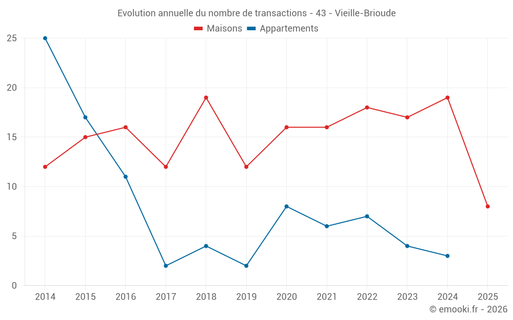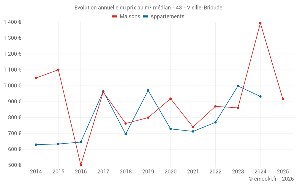 Le prix médian sur les 19 transactions de maisons des 12 derniers mois dans la commune de Vieille-Brioude était de 1 071 € par mètre carré pour une valeur foncière médiane de 105 000 €. Sur cette période 60% des transactions se sont situées entre 666 et 1 913 € par mètre carré (du 2ème au 8ème déciles).
