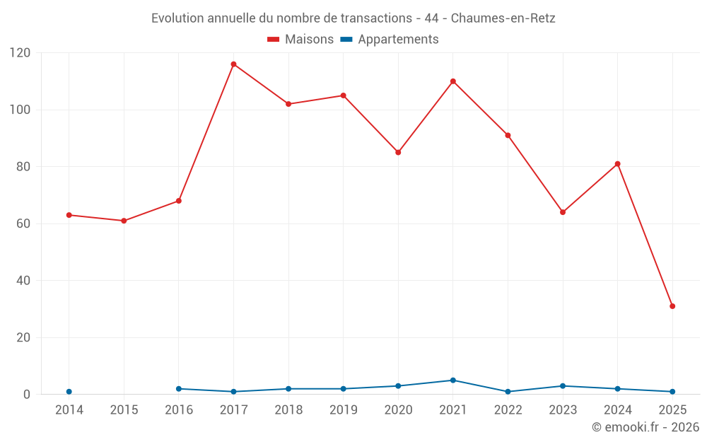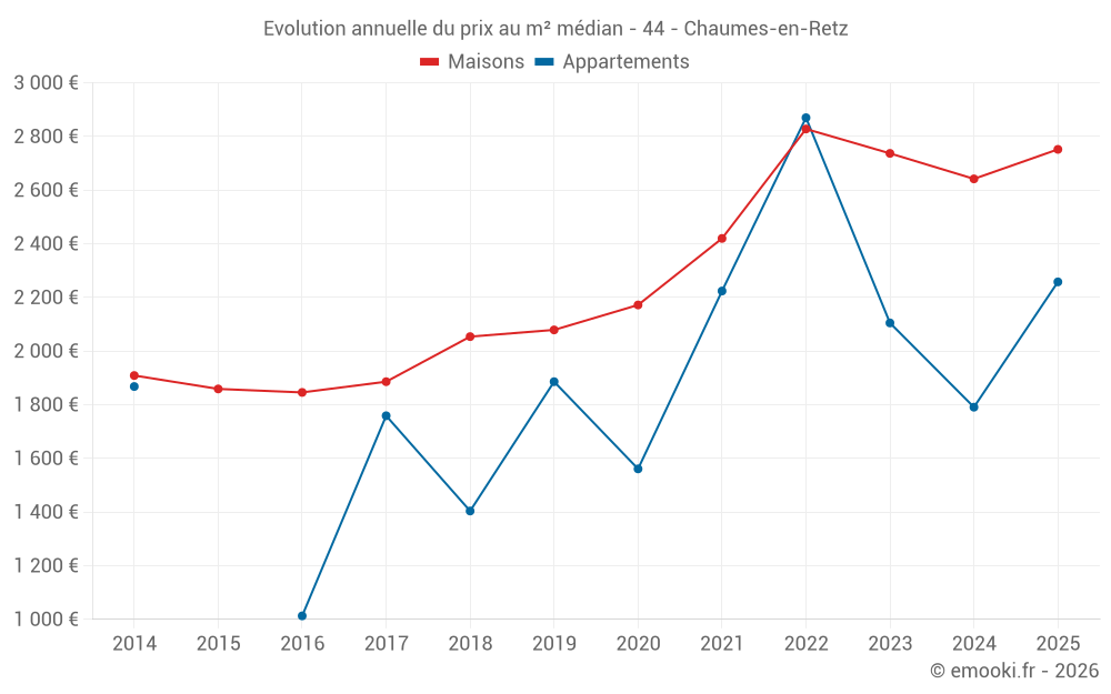 Le prix médian sur les 31 transactions de maisons des 6 derniers mois dans la commune de Chaumes-en-Retz était de 2 752 € par mètre carré pour une valeur foncière médiane de 240 000 €. Sur cette période 60% des transactions se sont situées entre 2 022 et 3 106 € par mètre carré (du 2ème au 8ème déciles).