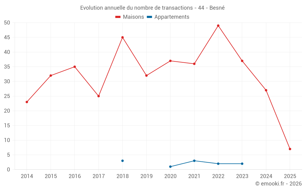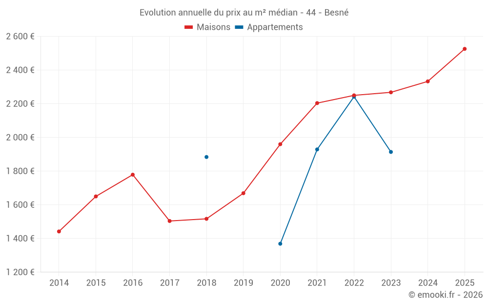 Le prix médian sur les 24 transactions de maisons des 12 derniers mois dans la commune de Besné était de 2 376 € par mètre carré pour une valeur foncière médiane de 220 000 €. Sur cette période 60% des transactions se sont situées entre 2 033 et 2 780 € par mètre carré (du 2ème au 8ème déciles).