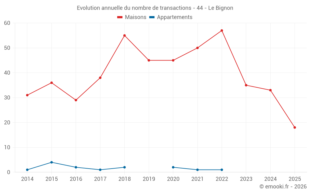 Le prix médian sur les 18 transactions de maisons des 6 derniers mois dans la commune du Bignon était de 2 949 € par mètre carré pour une valeur foncière médiane de 262 500 €. Sur cette période 60% des transactions se sont situées entre 2 305 et 3 337 € par mètre carré (du 2ème au 8ème déciles).