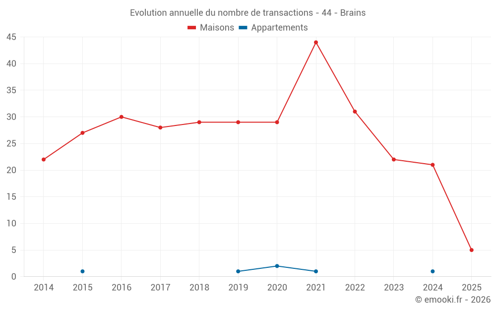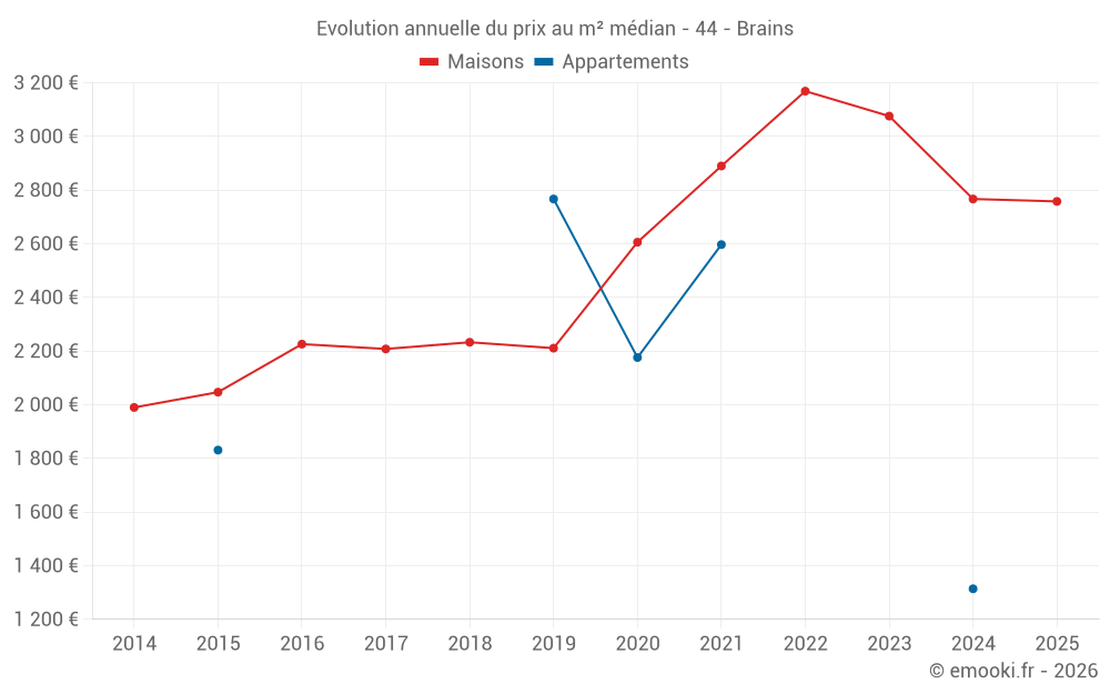 Le prix médian sur les 22 transactions de maisons des 12 derniers mois dans la commune de Brains était de 2 778 € par mètre carré pour une valeur foncière médiane de 247 567 €. Sur cette période 60% des transactions se sont situées entre 2 455 et 3 379 € par mètre carré (du 2ème au 8ème déciles).