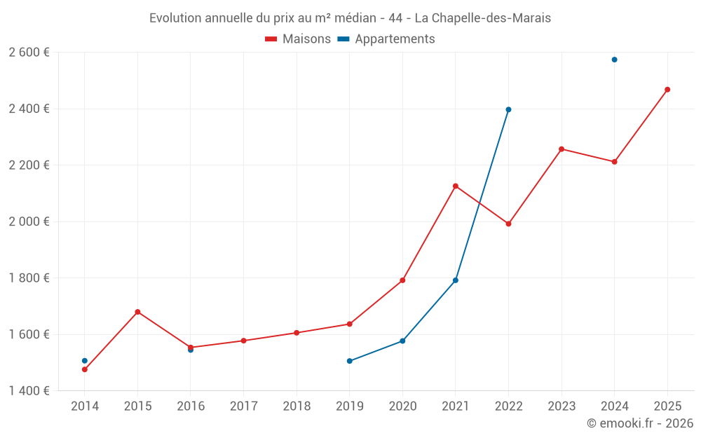 Le prix médian sur les 35 transactions de maisons des 12 derniers mois dans la commune de la Chapelle-des-Marais était de 2 321 € par mètre carré pour une valeur foncière médiane de 185 000 €. Sur cette période 60% des transactions se sont situées entre 1 750 et 2 715 € par mètre carré (du 2ème au 8ème déciles).